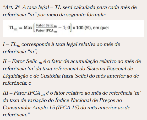 A taxa legal, cujo cálculo competirá ao Conselho Monetário Nacional (CMN) e a divulgação ao Banco Central, “corresponderá à taxa referencial do Sistema Especial de Liquidação e de Custódia (Selic), deduzido o índice de atualização monetária” previsto no artigo 389 do Código Civil (IPCA/IBGE ou outro que vier a substituí-lo):