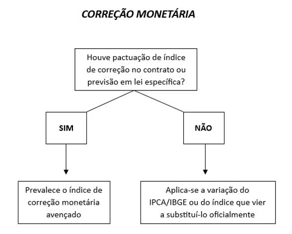 No que tange à atualização monetária, a novel redação do artigo 389 do Código Civil, prevê que, na falta de convenção entre as partes ou previsão em lei específica, será aplicada a variação do IPCA/IBGE ou do índice que vier a substituí-lo. Para perfeita compreensão, veja-se quadro esquemático: