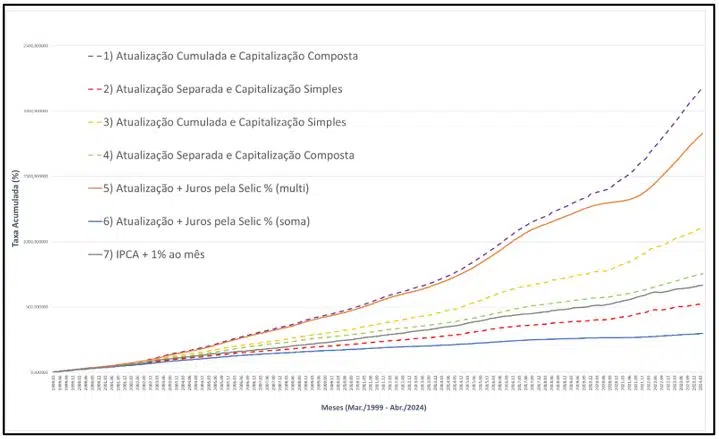 Comparando-se, portanto, a indicação da linha amarela (correspondente ao regime agora vigente), com a metodologia anteriormente utilizada (correção mais juros de 1% ao mês), ilustrada pela linha cinza, vê-se que, ao menos no acumulado dos últimos 25 anos, o novo método teria se saído mais oneroso ao devedor do que o anterior.